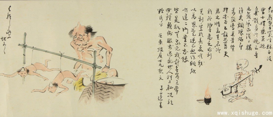 此卷是安政2年觀像执笔的《地狱绘卷》通过漫画首发描绘了地狱的各种悲催刑法,大鬼小鬼等,虽然是描绘地狱的景象,但是画面感是轻松活泼的。