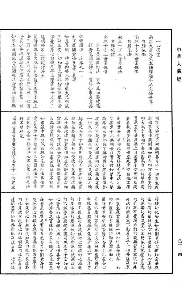 -内容完备。中国历代刊刻的二十余种大藏经都存在着收录不全的缺点,《中华大藏经》以《赵城金藏》作底本,其缺失部分以《高丽藏》补足,并按照《赵城金藏》千字文编次的目录体系,将历代大藏经中有千字文编次的特有经论按照内容性质悉数补入。收录经籍1939种,一万余卷,集历代刊刻大藏经之大成。