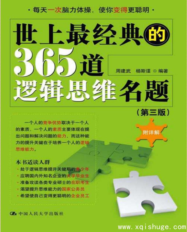 一个人的的竞争优势取决于一个人的素质,一个人的素质主要体现在提出问题和解决问题的能力,而这种能力的得升关键在于培养一个人的逻辑思维能力。《世上最经典的365道逻辑思维名题》适读人群:处于逻辑思维提升关键期的青少年,应聘国内外知名企业的大学毕业生,准备攻读各类专业硕士的在职考生,渴望提升思维能力的国家公务员,希望使自己变得更聪明的企业员工。